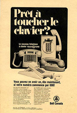 Les années 1970 marquent un moment décisif dans l’offre de produits et services de Bell, puisque l’entreprise adopte de nouvelles ressources novatrices comme les ordinateurs et la technologie numérique. Introduit chez Bell au milieu des années 1960, le clavier ouvre la voie à une interaction téléphone-ordinateur qui permet de soutenir les entreprises et leurs transactions commerciales. Les campagnes publicitaires du début de la décennie encouragent les abonnés à passer d’un téléphone à cadran à un téléphone muni d’un clavier qui permet une composition plus facile, précise et rapide. Cette technologie ouvre la voie aux services novateurs de l’ère numérique.