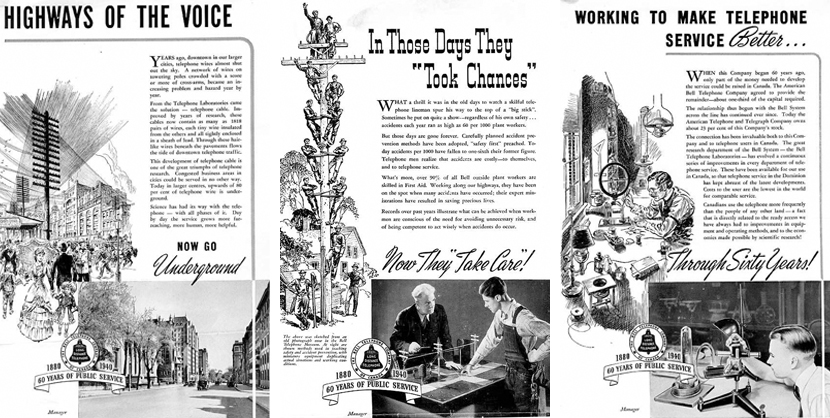 Like many other major North American corporations, Bell didn’t begin to feel the impact of the upheaval in Europe until several months after the conflict began. That’s why in 1940, Bell’s Publicity Department was mainly focused on highlighting an important company milestone - 60 years of continuous service since Bell’s creation in 1880. The anniversary inspired a new and ambitious public awareness campaign, including the creative below highlighting 6 decades of technological advancements and innovation.