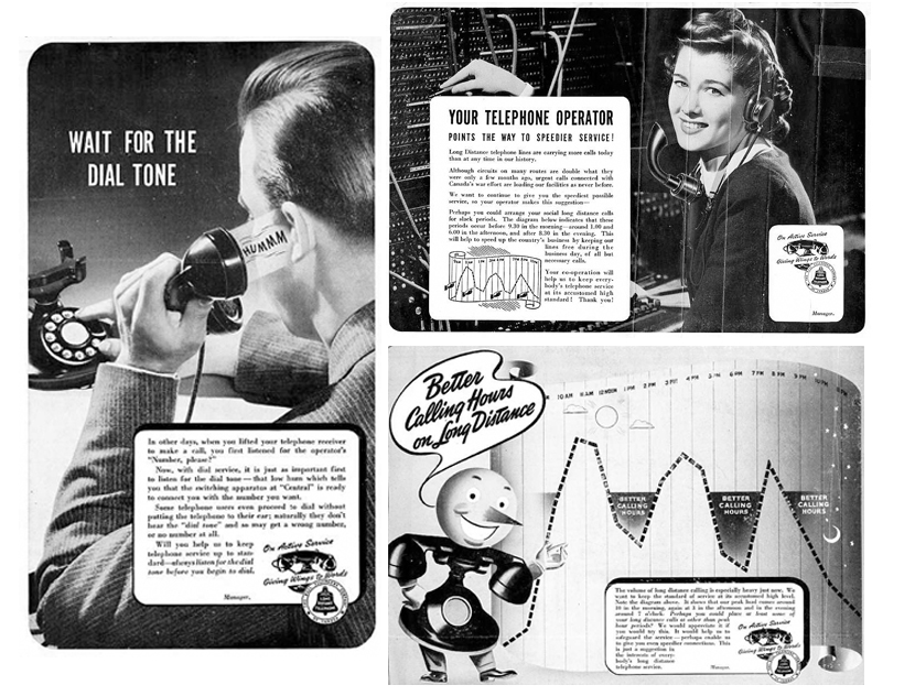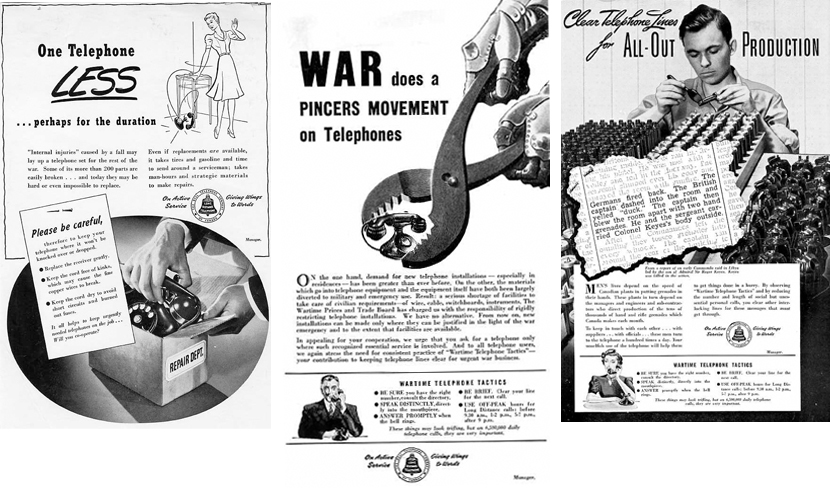 1942 was a critical year for Bell as government control of metals and other commodities intensified, significantly impacting the manufacturing sector. Bell was only able to build new infrastructure when the projects were justified by the war effort. Because demand for telephone service continued to increase, Bell launched a new publicity campaign – the “Wartime Telephone Tactics” series – asking subscribers to do their part to keep telephone lines clear for emergencies. It also showed them how to maintain their phones and other equipment during a shortage of resources during wartime, when things like wire, cable and switchboards were being diverted to military use.