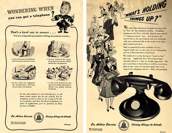 By the end of 1944, approximately 70,000 Bell service orders for the civilian population remained unfulfilled. To ensure that future clients remained patient, advertisements such as the following answered the question “What’s holding things up?”.