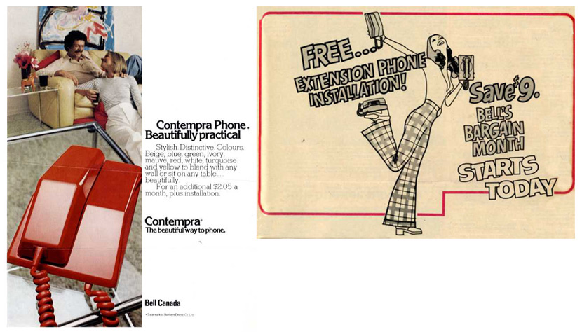 The residential market experienced a shift as well, with Bell implementing multiple new strategies to boost phone sales. C.W. Kirkpatrick, Bell’s General Manager of Marketing in 1972 said: “The company has not yet fully exploited the full potential of the extension home phone market.” Marketed in the late 1960s, the iconic Contempra phone was the first device entirely designed and manufactured in Canada, and was the focus of several popular advertising campaigns. Bell also launched “A Month for You” ads in November 1972, highlighting that customers could, for the first time, save the $9 installation charge when they bought a new phone.