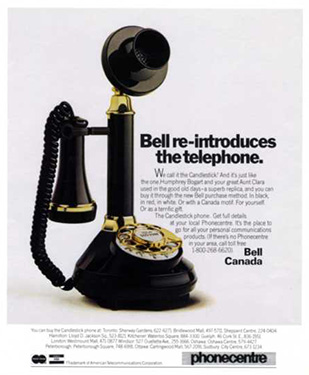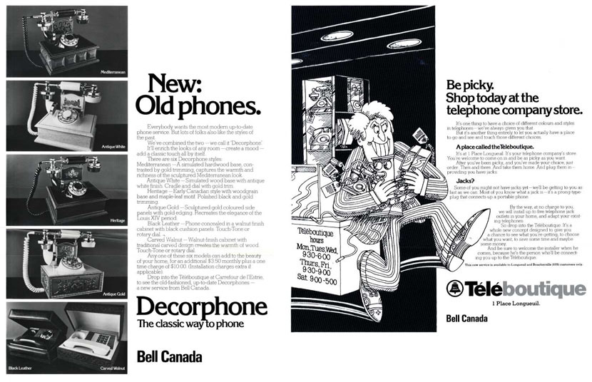 In 1974, Bell announced a completely new retail concept with the opening of its Téléboutique/Phonecentre stores, which enabled subscribers to order phones, return or exchange equipment, or have their telephone repaired, without the need to make a service appointment with a Bell technician. Ads from the period feature an array of phones with vibrant colours and designs. Téléboutique/Phonecentre customers were encouraged to bring an upholstery sample from home so that trained sales agents could help them choose a phone that matched their décor! A product catalogue was also published in the telephone directory for the first time, further widening the reach of Bell’s product offering.